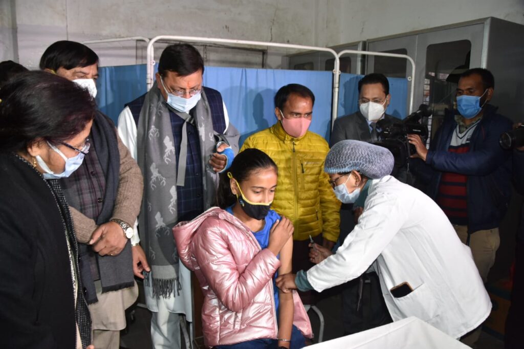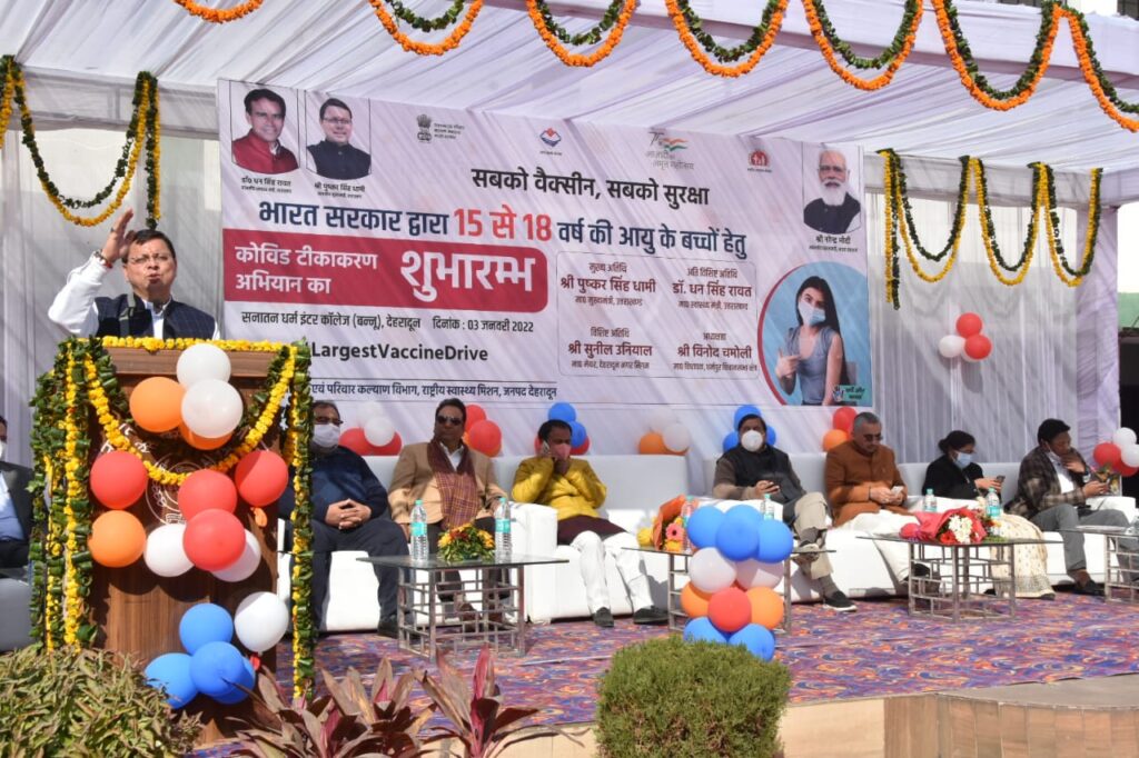 मुख्यमंत्री श्री पुष्कर सिंह धामी ने कहा कि एक सप्ताह में प्रदेश के 15 से 18 वर्ष के सभी 06 लाख 28 हजार किशोरों का टीकाकरण किया जायेगा। मुख्यमंत्री ने इसके लिए प्रदेशवासियों की ओर से प्रधानमंत्री श्री नरेन्द्र मोदी का आभार व्यक्त किया। उन्होंने कहा कि प्रधानमंत्री श्री नरेन्द्र मोदी की दूरगामी सोच के परिणामस्वरूप ही सबको सुरक्षा का कवच मिला है। देश में कोविड की जब पहली लहर आयी, प्रधानमंत्री के नेतृत्व में इससे बचाव के लिए अनेक अनुसंधान किये। भारत में कोविड से बचाव के लिए दो स्वदेशी वैक्सीन निर्मित की गई।